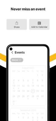 The event section shows a list of events throughout the district. Users can add an event to your calendar to share the event with friends and family with one tap.